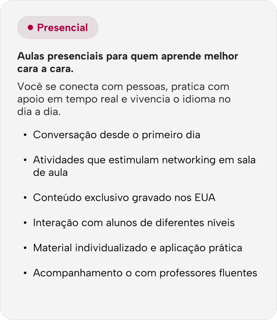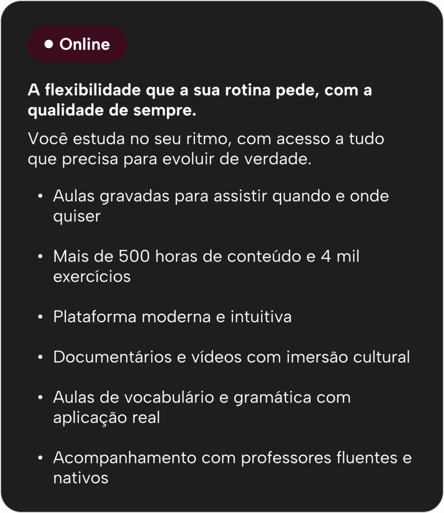 Temos os dois formatos. No online, você assiste quando e onde quiser. No presencial, você aprende em sala com professores fluentes.